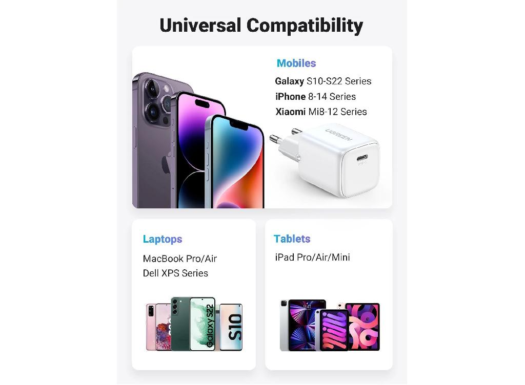 Iti pasa de timp? Cu UGREEN, nu trebuie sa asteptati prea mult pana cand dispozitivele sunt gata de utilizare din nou! Incarcatorul CD319 ofera o putere de pana la 30W, ceea ce inseamna ca permite, de exemplu, in aproximativ 30 de minute sa se incarce un iPhone 13 mini pana la 60%, un iPad Pro pana la 35% si un Huawei Mate 40 Pro pana la 32%. Produsul accepta standarde de incarcare rapida precum PD 3.0 / 2.0, QC4.0 / 3.0, PPS, SCP 10 V / 2 A, FCP etc.