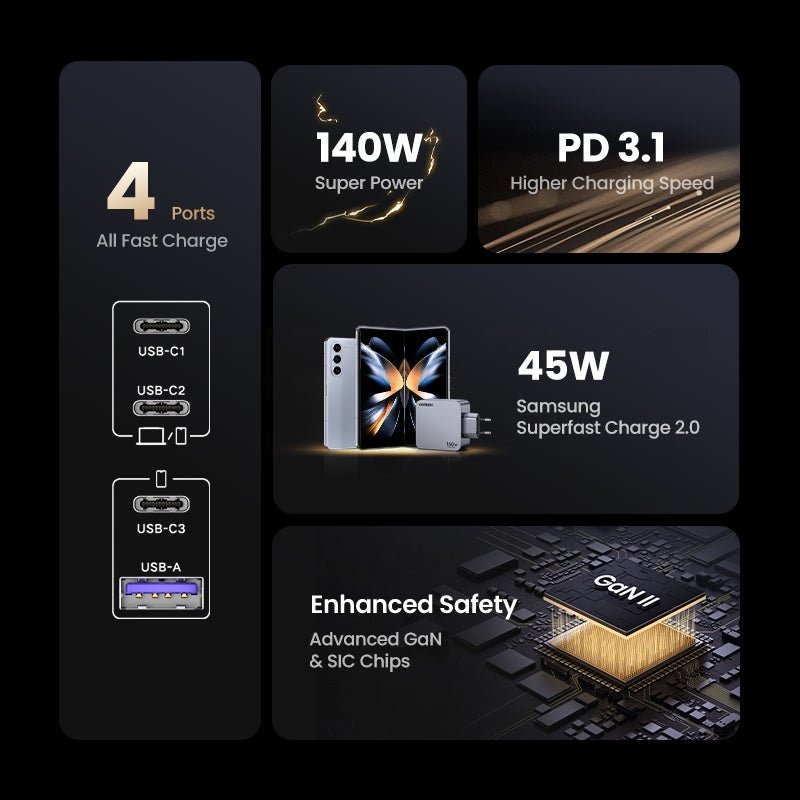 Cu 4 porturi (3x USB-C și 1x USB-A), tehnologie GaNInfinity de ultimă generație și un cablu Type-C inclus de 240W, acest încărcător este ideal pentru laptopuri, telefoane, tablete și multe altele. Rapid, inteligent și sigur – exact ce ai nevoie acasă sau în deplasare.