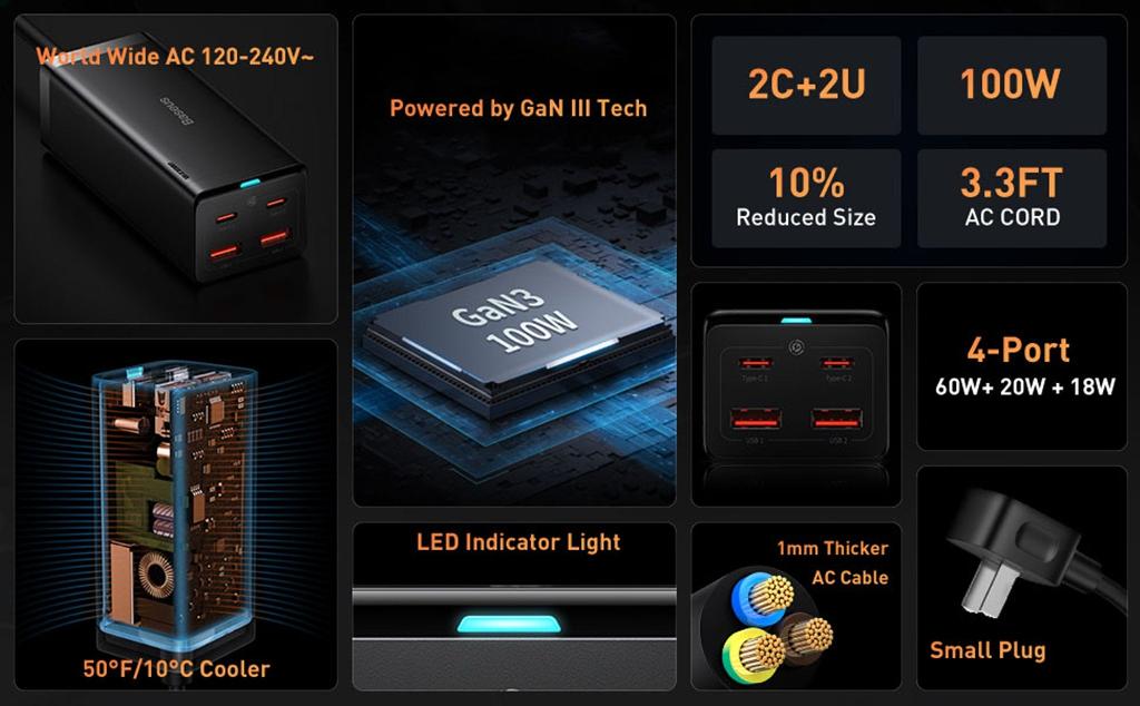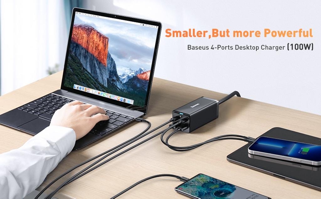 Încărcătorul BASEUS GaN3 Pro 100W este soluția ideală! Dotat cu 4 porturi (2xUSB-A + 2xUSB-C), acesta este compatibil cu cele mai noi tehnologii de încărcare rapidă – PD3.0, QC4.0, PPS, SCP – oferind performanță maximă pentru laptopuri, telefoane, tablete sau alte gadgeturi moderne.