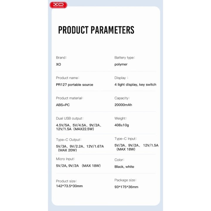 🔋 Acumulator extern XO PR127 20000mAh – Putere dublă, viteză maximă de încărcare!