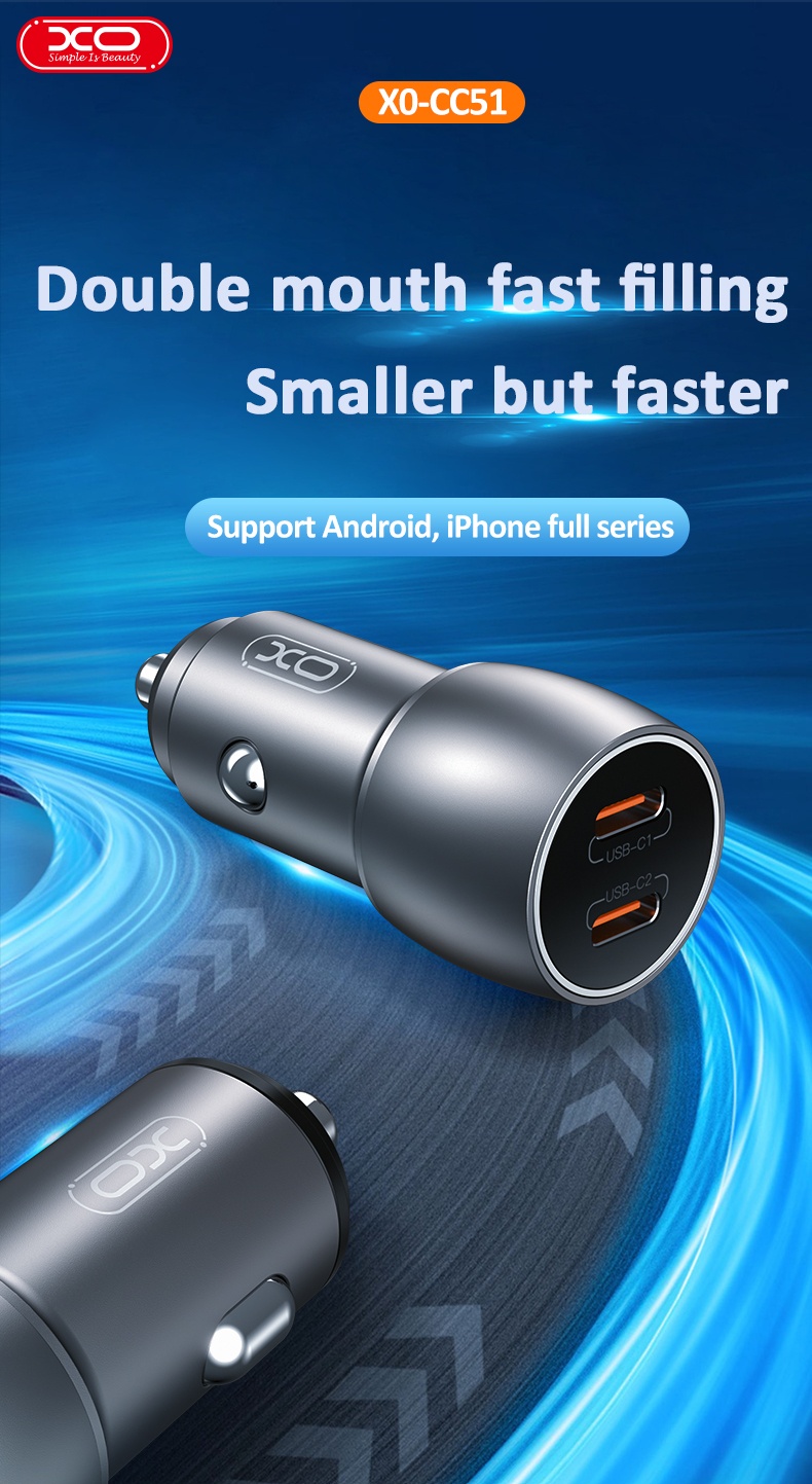 Alege încărcătorul auto XO CC51 pentru o alimentare rapidă și eficientă în timpul deplasărilor. Cu două porturi USB-C și suport pentru tehnologia Power Delivery, acest model compact îți permite să încarci simultan două dispozitive, fiind ideal pentru utilizarea zilnică sau călătorii.