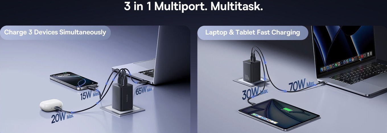 USB-C1 + USB-C2 + USB-A: 60W + 22W + 18W