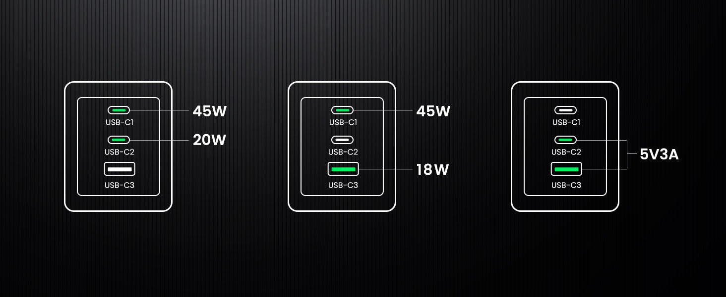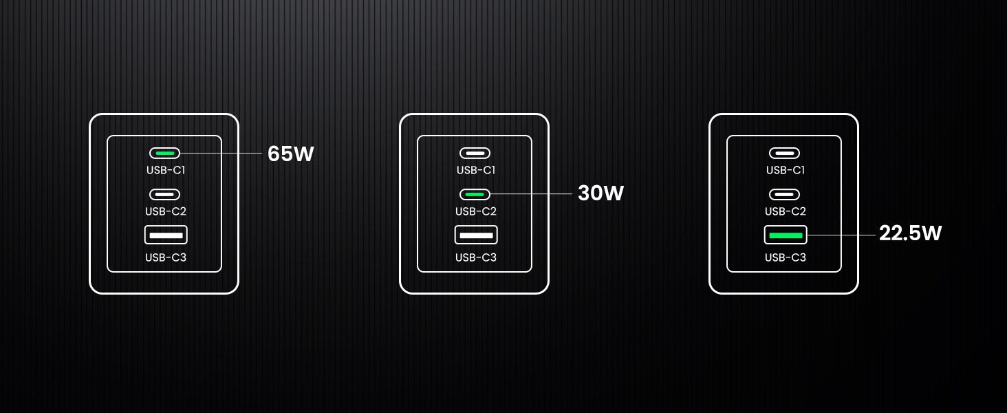 Cu 2 porturi USB-C și 1 port USB-A, poți alimenta simultan până la 3 dispozitive — laptop, telefon și tabletă — menținând spațiul de lucru ordonat și eficient.